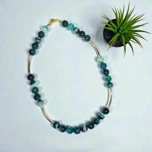 Banded agate necklace made with blue/green 12mm beads, gold plated spacerss and a gold plated magnetic clasp. 52cm long. Gift boxed.
